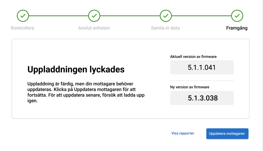 När uppladdningen är klar ser du den här skärmen som bekräftar att uppdateringen lyckades. Tryck på “stäng”-knappen och koppla ur mottagaren och påbörja en ny sensorsession.