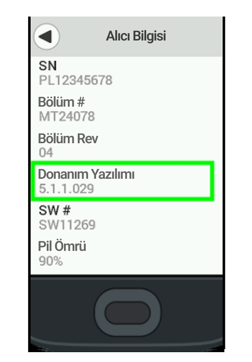 Lütfen bu görüntünün yalnızca Dexcom G6 Alıcısının ekranında donanım yazılımı numarasının nerede bulunduğunu gösteren bir örnek olduğunu unutmayın. Bu güncelleme için donanım yazılım numarası: 5.1.2.038
